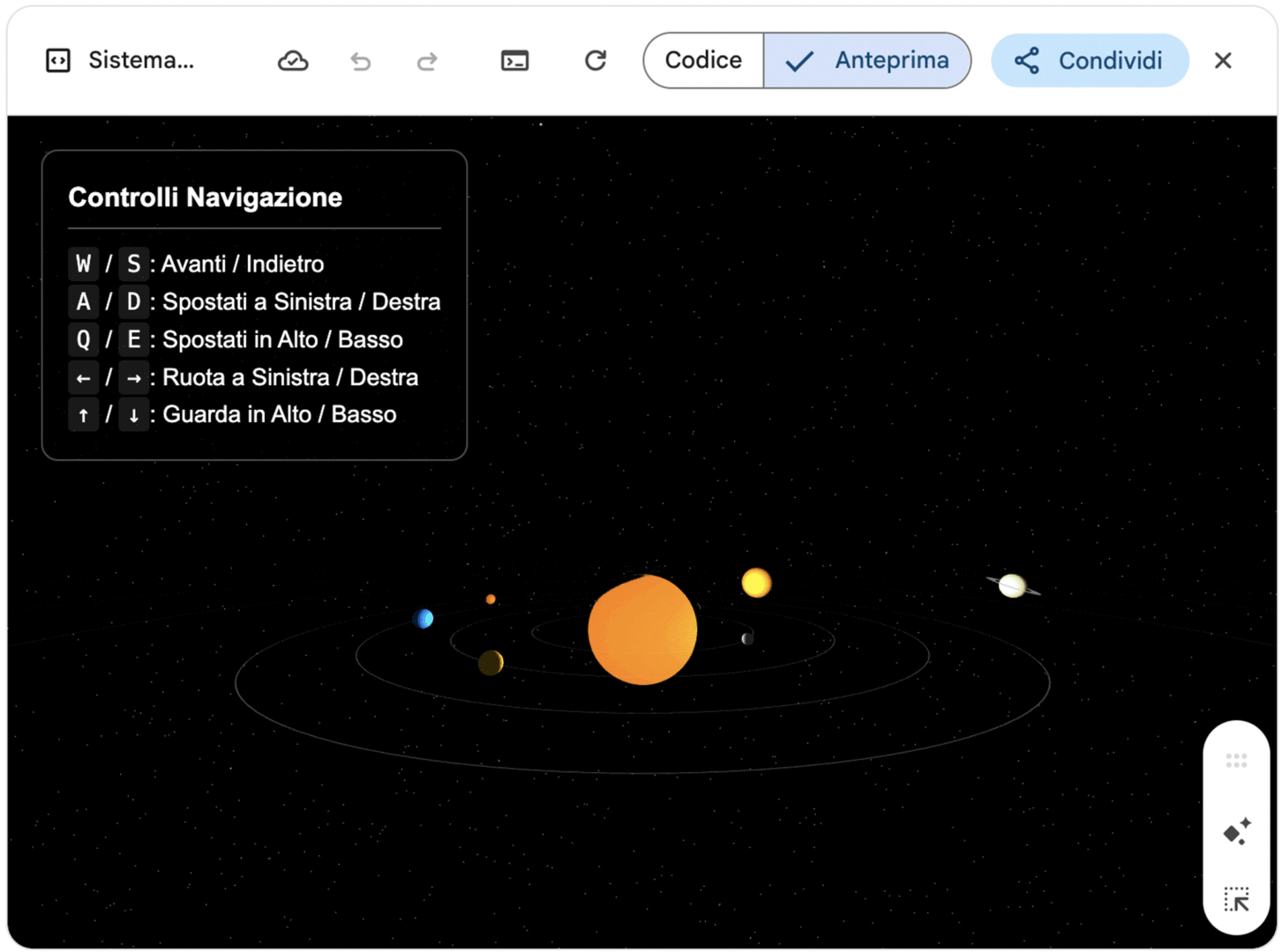 Poco dopo, però, è riuscito a generare una visualizzazione, molto accattivante, del sistema solare in Three.js, completamente navigabile con i tasti e pubblicabile sul web.