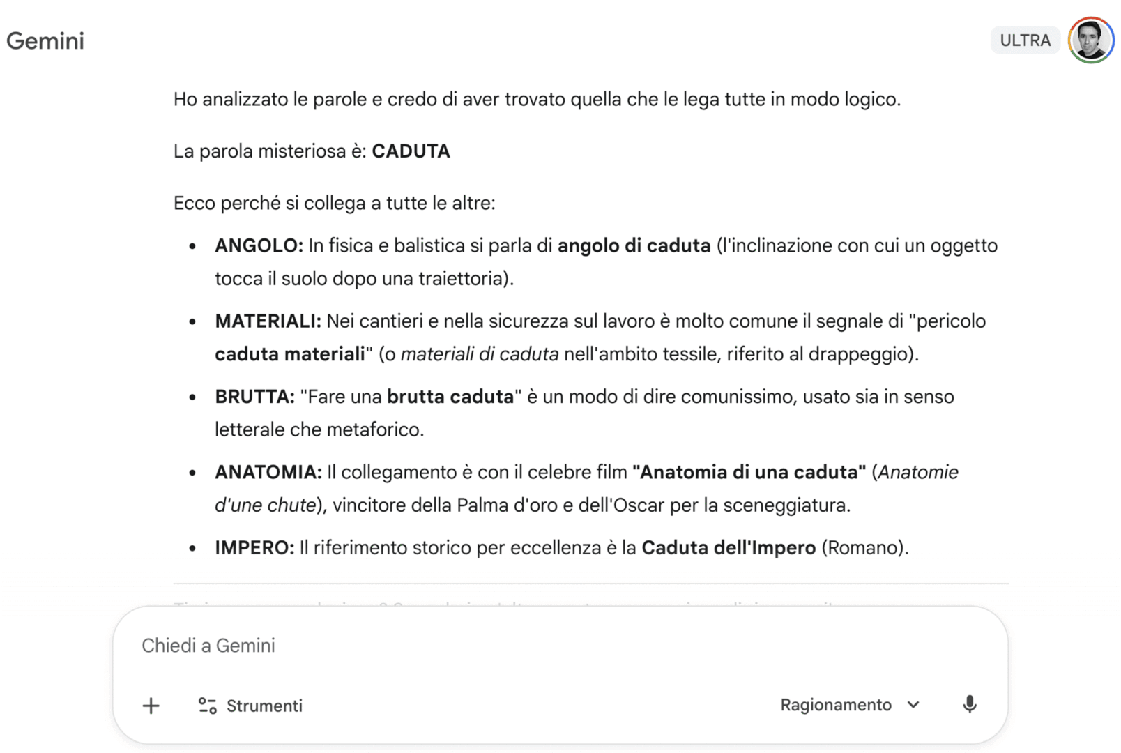 Sul fronte del ragionamento puro, Gemini 3.0 mostra grandi abilità (anche senza l’attivazione della funzione “Deep Think”). L’ho messo alla prova con il test della “Ghigliottina”, noto gioco di associazioni logiche che richiede pensiero laterale e profonda conoscenza culturale. Il modello ha risolto l’enigma senza esitazioni, a differenza di GPT-5.1, dimostrando una flessibilità cognitiva che mancava nelle versioni precedenti.