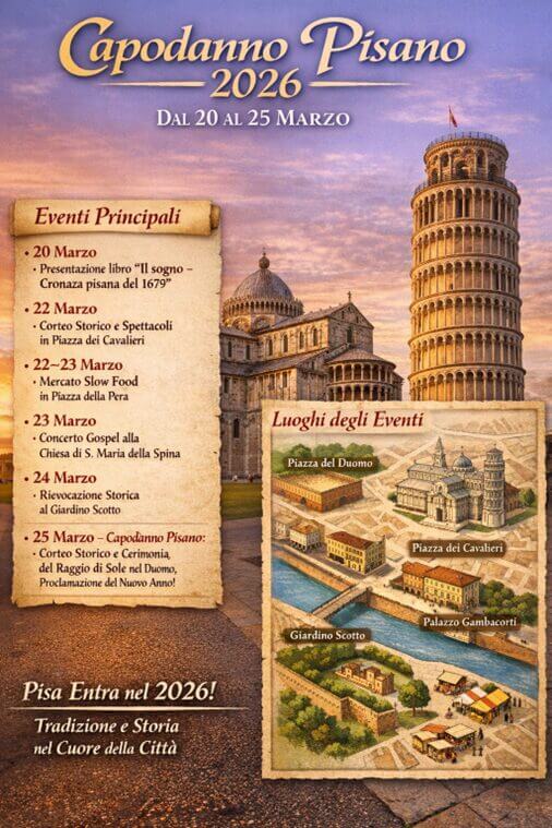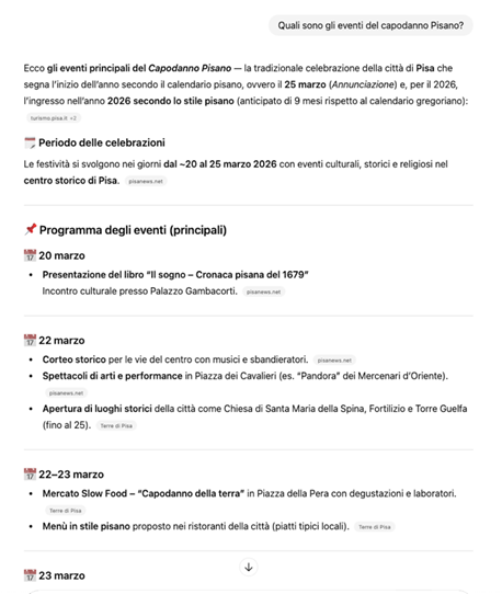 Una novità importante è la capacità di realizzare immagini con molto testo, come avviene, per esempio, in una locandina. In una chat, ho chiesto gli eventi del Capodanno Pisano e poi di generare una locandina con un’immagine di sfondo e una mappa dei luoghi principali.