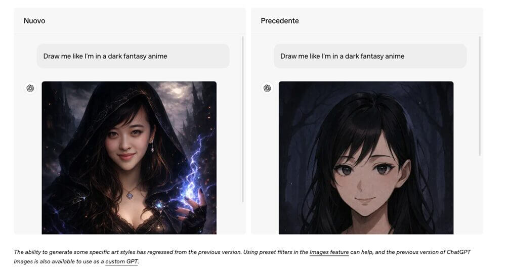 OpenAI indica che il nuovo modello ha anche alcune limitazioni, anche nello svolgimento di compiti che il predecessore gestiva in modo più accurato. È il caso dell’applicazione dello stile “dark fantasy anime” a una foto, che viene mantenuta come foto e non renderizzata come cartone animato.
