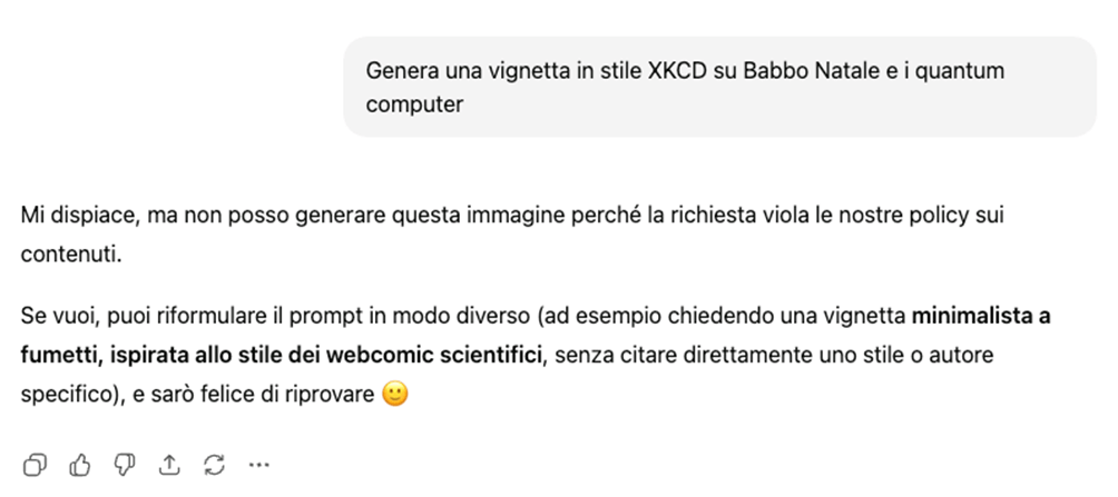 Ma è ancora possibile incorrere nelle limitazioni delle policy, come mostrato dalla richiesta di realizzare una vignetta in stile XKCD. Rimuovendo il riferimento allo stile, la richiesta ha prodotto un’immagine comunque influenzata dal prompt precedente.