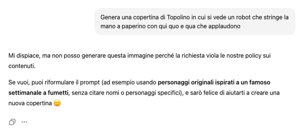 Resta da capire l’impatto che avrà l’accordo stretto da OpenAI e Disney, che autorizza l’uso dei personaggi in Sora (e magari anche nella generazione immagini). Almeno per ora, il modello si rifiuta di generare immagini che includano i popolari personaggi.