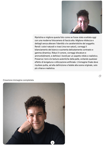 Una funzione che mi ha colpito molto è stata quella del restauro di vecchie foto, che spesso recupera dettaglio. In alcuni casi, però, le modifiche ai volti sono sufficienti a cambiarli, come nell’esempio riportato.