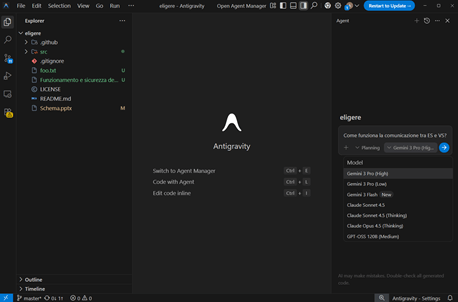 Ecco che strumenti come Visual Studio Code sono stati rapidamente estesi con plugin e strumenti capaci di consultare i modelli e interagire con il codice. Si tratta di un approccio così importante che Google per non perdere terreno ha creato un nuovo editor basato su VSCode chiamato Antigravity ed ovviamente modificato per mettere al centro del funzionamento l’AI. Così come in VSCode GitHub Copilot è integrato e consente di utilizzare sia modelli in cloud che on-premises anche Antigravity segue la stessa filosofia, ovviamente proponendo Gemini come modello di default.