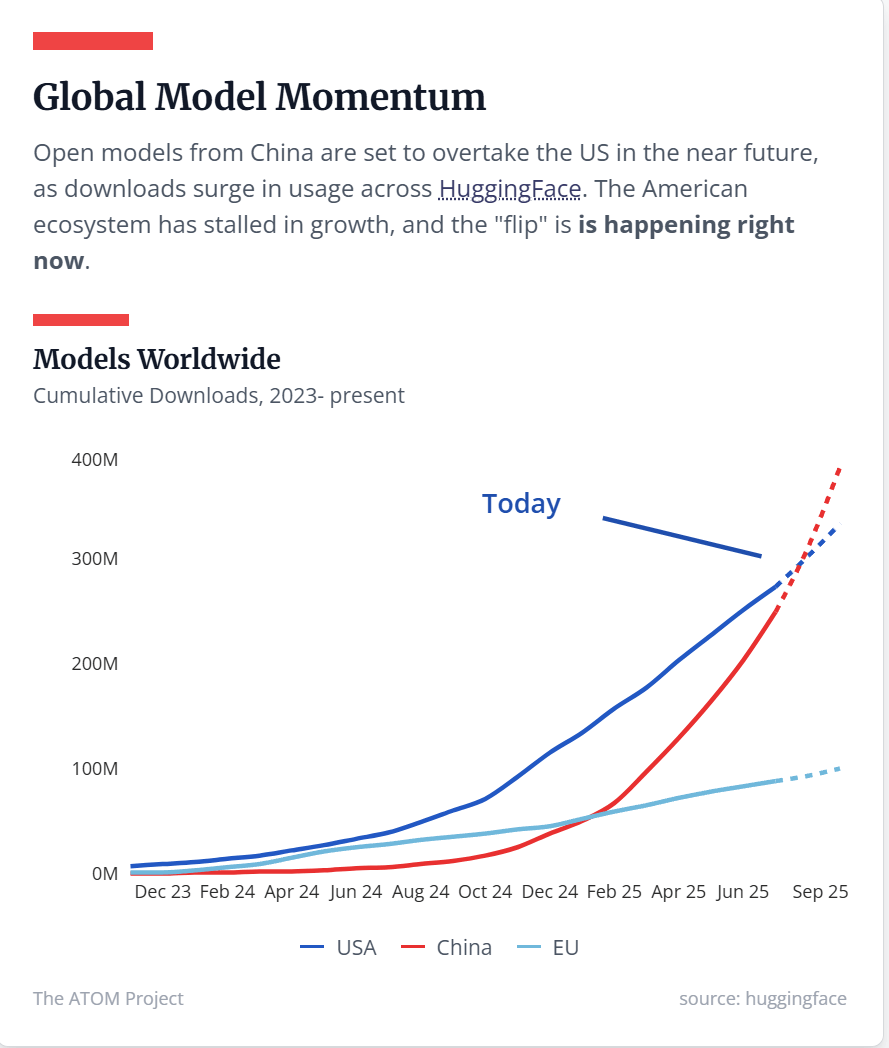 Il rapporto Project ATOM di Nathan Lambert documenta esplicitamente questo fenomeno, illustrando come i modelli cinesi stiano “ribaltando” le offerte americane come Llama in termini di adozione e slancio delle prestazioni.