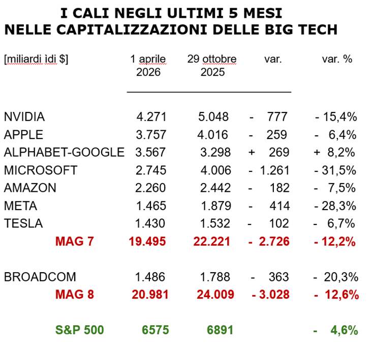 Le Borse, che da ormai molti anni hanno proiettato ai vertici mondiali per capitalizzazione le cosiddette “Magnificent Seven (Mag 7)” – Alphabet-Google, Amazon, Apple, Meta, Microsoft, Nvidia e Tesla (con Broadcom che periodicamente ha preso il posto di Tesla) – sono entrate da cinque mesi circa a questa parte in una fase di crescenti dubbi sulla validità degli enormi investimenti che diverse di esse stanno facendo nelle infrastrutture per l’AI e ne hanno ridotto le valutazioni, con una accentuazione nell’ultimo mese dopo lo scoppio della guerra US-Israele-Iran (ancorché con continue fluttuazioni legate alle prospettive di durata della guerra).