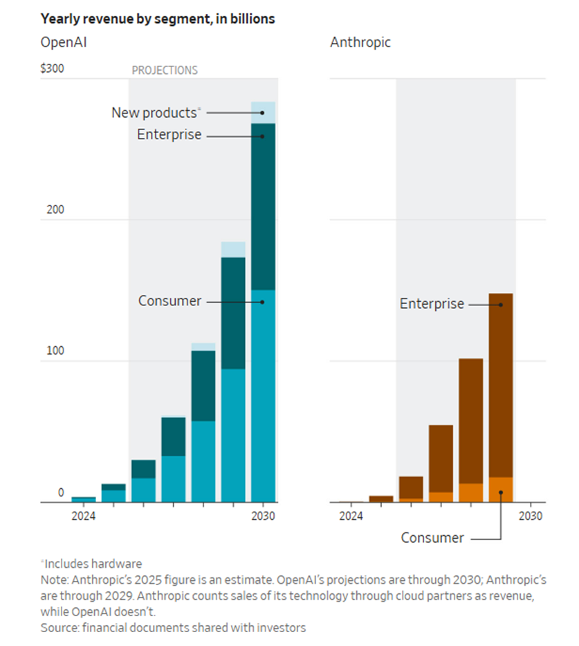 E qualcosa di simile, con una sorta di rincorsa l’una con l’altra, è avvenuto con OpenAI e Anthropic (nella Fig. 2 le previsioni di crescita dei loro ricavi nei prossimi anni, da esse formulate e riportate in “An Inside Look at OpenAI and Anthropic’s Finances Ahead of Their IPOs – Silicon Valley’s hottest startups have the same challenge: funding giant computing costs”, WSJ, 5 aprile).