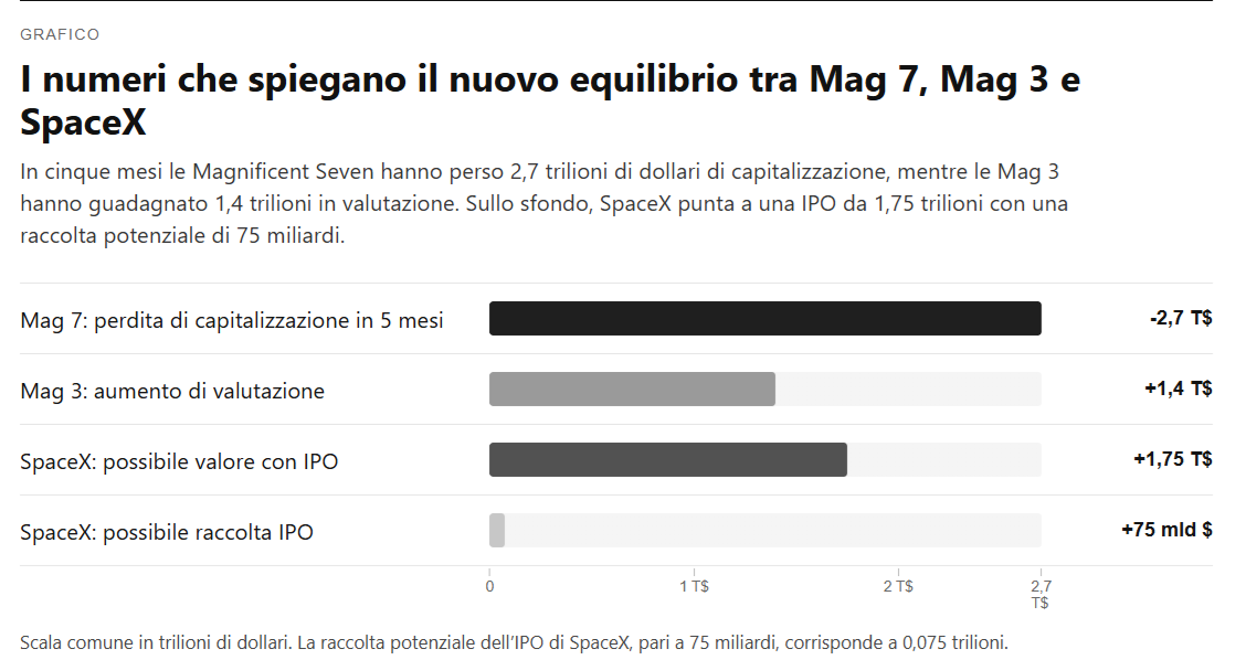 - le Mag 7 capitalizzavano complessivamente 22,2 trilioni di $ e le Mag 8 24 trilioni: valori che, al mero scopo di avere un ordine di grandezza, possono essere posti a raffronto con il PIL statunitense e con quello italiano del 2025: rispettivamente 30,62 e 2,54 trilioni di $.