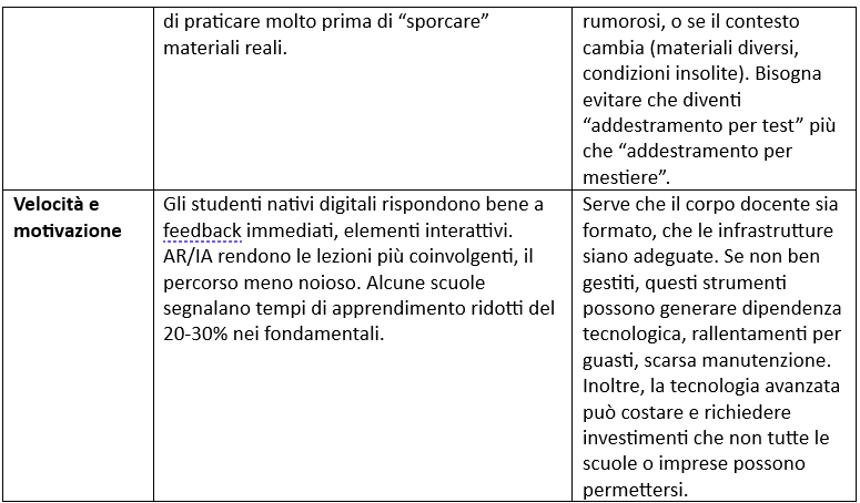 Se pur sussistano ancora delle resistenze sull’utilizzo delle nuove tecnologie in questi mestieri, l’utilizzo della realtà virtuale e dell’intelligenza artificiale amplieranno invece questa esperienza. L’intelligenza artificiale, infatti, diventa un tutor paziente, capace di correggere gli errori e migliorare la tecnica. La realtà virtuale al contrario può trasformare una lezione in un’avventura interattiva, rendendo l’apprendimento più sicuro, sostenibile e anche più stimolante.