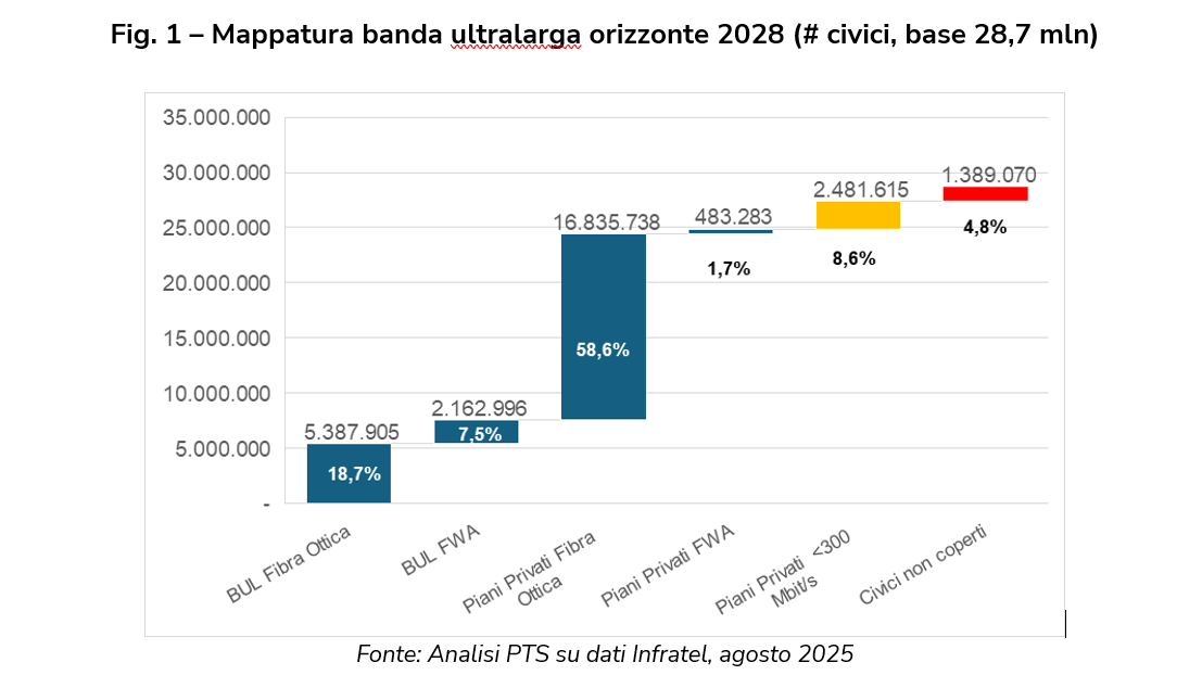 L’orizzonte di riferimento è il 31 dicembre 2028 e la mappatura ha riguardato gli interventi attuati o pianificati dagli operatori privati a partire dal 2025, con l’obiettivo di valutare il livello di copertura delle reti fisse NGA (Next Generation Access) in grado di permettere una velocità di picco maggiore di 300 Mbit/s.