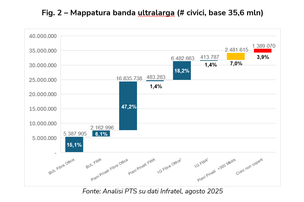 Con questa rappresentazione il contributo delle reti private sale al 68% (sebbene quelle del piano 1 Giga prevalentemente finanziate con risorse pubbliche) e i civici non coperti scendono al 10,9%.