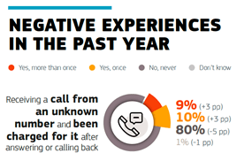 L’indagine ha anche esplorato il fenomeno delle truffe telefoniche e degli addebiti imprevisti. Circa un quinto dei consumatori europei e italiani ha sperimentato almeno una volta nell’ultimo anno di ricevere chiamate da numeri sconosciuti che hanno generato costi dopo aver risposto o richiamato: il 19% degli europei e il 21% degli italiani ha subito questo tipo di frode, con il 9% in entrambi i casi che l’ha sperimentata più di una volta. Situazione analoga per gli SMS non richiesti che hanno generato addebiti dopo l’apertura o la risposta: anche in questo caso siamo al 19% per gli europei e al 22% per gli italiani. Questi dati evidenziano la persistenza di pratiche fraudolente che sfruttano le vulnerabilità dei sistemi di telefonia e la scarsa consapevolezza dei consumatori.