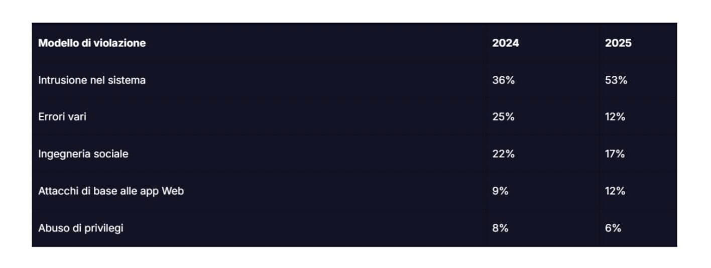 Secondo quanto si evince dal report Verizon DBIR 2025, nel 2025, si sono evoluti i modelli di violazione rispetto all’anno precedente. In particolare, l’intrusione di sistema ha assunto il ruolo di modello di violazione più diffuso, rispetto al 2024. Ciò suggerisce che gli aggressori si affidano sempre più a campagne multi-fase che coinvolgono hacking, malware e ransomware. Allo stesso tempo, il calo degli errori vari e dell’uso improprio dei privilegi potrebbe indicare un miglioramento delle misure di sicurezza interne o semplicemente un cambiamento nelle strategie degli aggressori. Inoltre, nonostante lievi cambiamenti, il social engineering e gli attacchi alle app web di base continuano a persistere, evidenziando le continue sfide dell’uso improprio delle credenziali e del phishing in tutti i settori.