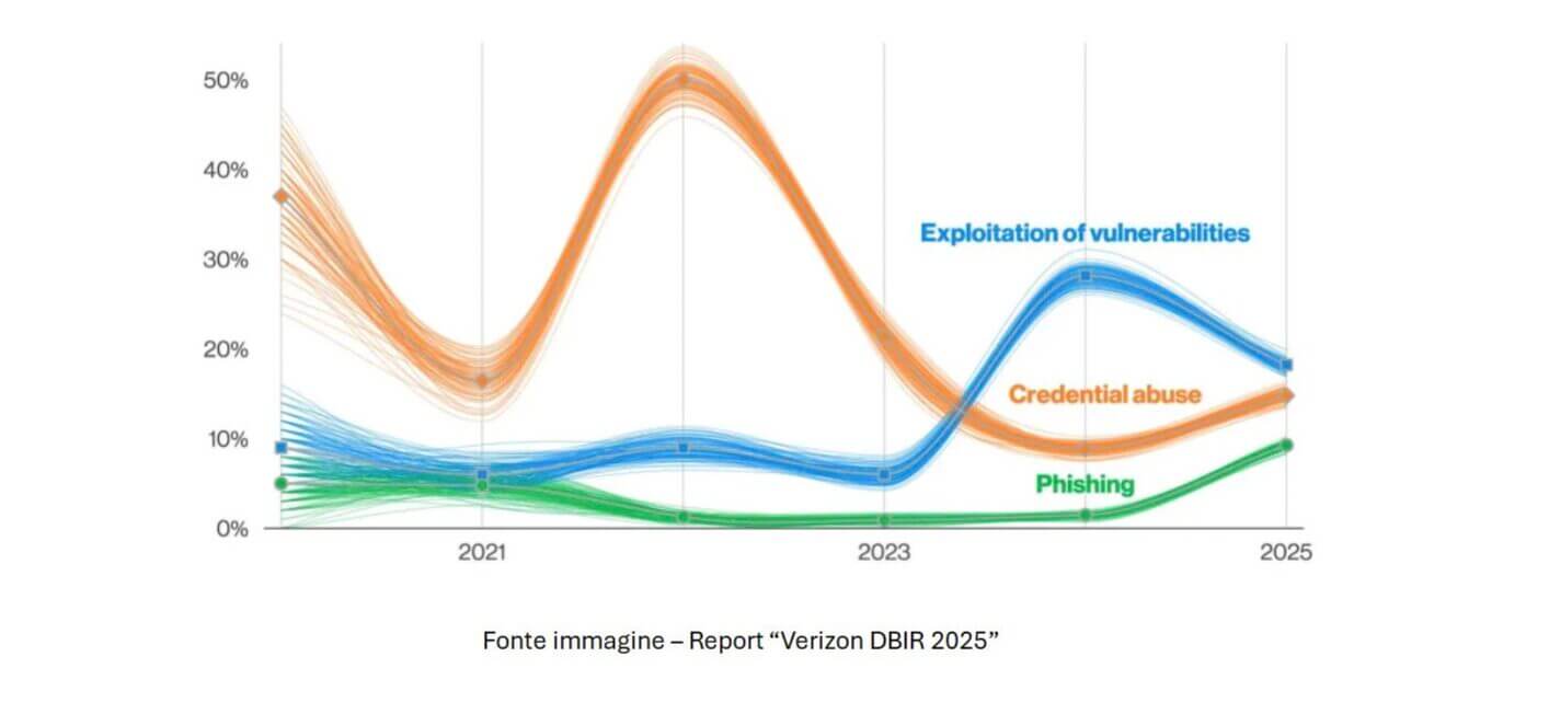 Secondo il DBIR 2025, il 20% delle violazioni inizia ora con lo sfruttamento delle vulnerabilità, con un aumento del 34% rispetto allo scorso anno. Questo vettore di attacco sta rapidamente raggiungendo l’ abuso delle credenziali , che rimane il principale metodo di accesso iniziale.