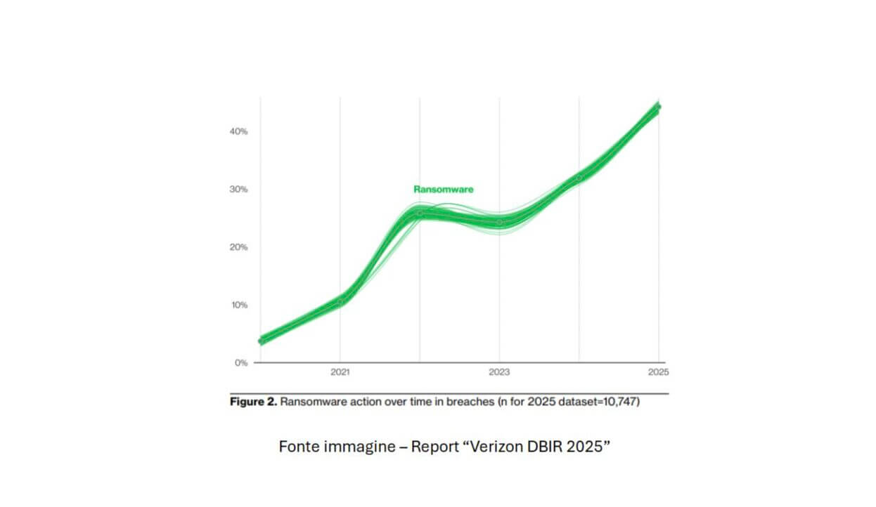 Il ransomware continua a dominare il panorama delle minacce informatiche, essendo responsabile del 44% di tutte le violazioni secondo quanto si evince dal DBIR 2025 di Verizon, in forte aumento rispetto al 32% dell’anno precedente. Gli aggressori prendono sempre più di mira le piccole e medie imprese, dove il ransomware è stato coinvolto in ben l’88% delle violazioni, rispetto al 39% nelle grandi organizzazioni.