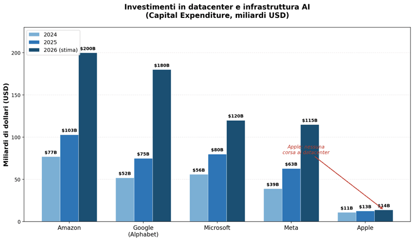 Mentre Apple punta sull’intelligenza on-device, i suoi concorrenti stanno investendo somme senza precedenti nella costruzione di datacenter. I numeri sono impressionanti: nel 2026, i cinque maggiori “hyperscaler” (Amazon, Google, Microsoft, Meta e Oracle) spenderanno complessivamente oltre 600 miliardi di dollari in infrastruttura, di cui circa il 75% destinato specificamente all’IA.[12][13] Fortune ha notato, con una certa preoccupazione, che questa cifra supera il PIL della Svezia.[14]