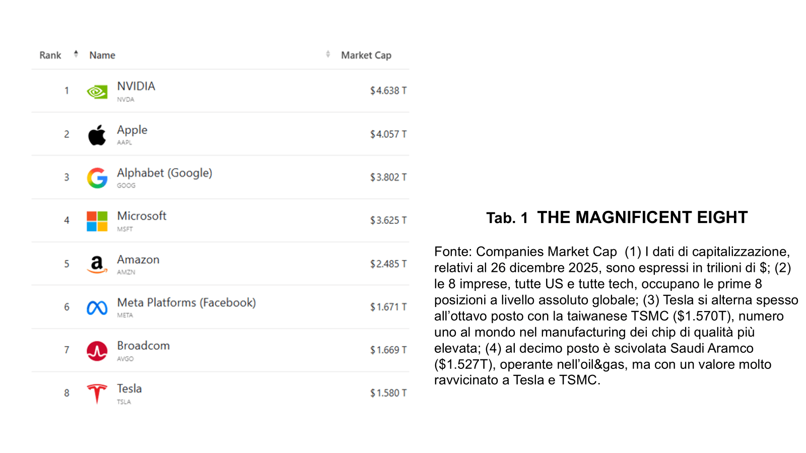 Il paragone è improprio, ma volendo dare una idea più concreta di cosa significhino i numeri che stiamo discutendo, il valore complessivo delle MAG_8 può essere messo a raffronto con il PIL statunitense (29,2 trilioni) e quello aggregato dei Paesi UE (19,4) del 2024: le MAG_8 complessivamente valgono oltre l’80% del primo e il 20% circa in più del secondo (valori che sarebbero evidentemente tutti da ricalcolare per il 2025 a causa dell’effetto combinato della diversa crescita del PIL statunitense ed europeo e della forte svalutazione del $ rispetto all’euro).