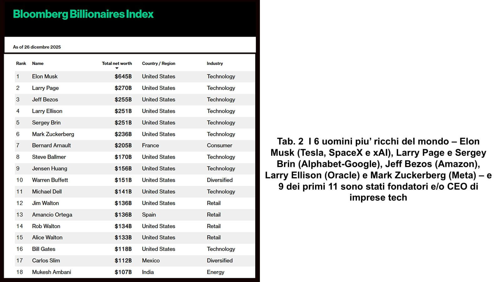 La Tab. 2, che riporta i primi nomi della lista (aggiornata al 26 dicembre 2025), mostra come siano di origine tech: