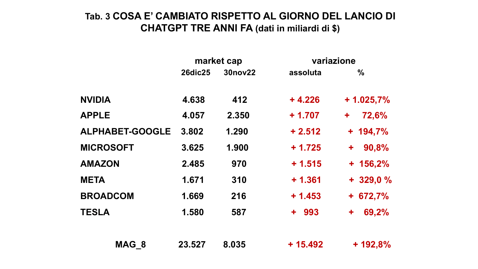 Nella Tab. 3 ho posto a confronto i dati delle capitalizzazioni delle MAG_8 il 30 novembre 2022, giorno in cui Sam Altman lanciò ChatGPT e con esso l’AI cosiddetta “generativa”, e quelli relativi al 26 dicembre 2025.
