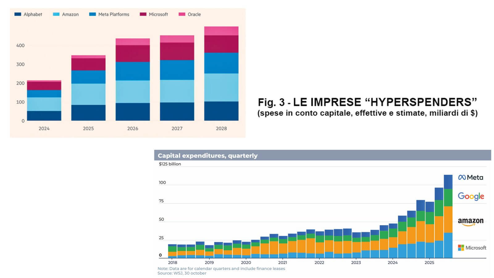 La differenza rispetto alla crisi di allora è stata data finora dal ruolo giocato nell’infrastrutturazione AI dalle Big Tech, e in particolare dai cosiddetti hyperscalers/hyperspenders (Amazon, Microsoft, Alphabet-Google e Meta) fra di esse, in grado di finanziare i data center con i propri “net cash flow” (realizzati nei loro business storici) senza ricorrere a indebitamenti: un ruolo destinato però a ridursi come discuterò nel seguito, sia per l’entrata in gioco di nuovi attori (quale OpenAI che ha sottoscritto impegni per un ammontare di 1,4 trilioni di $ essendo attualmente fortemente in perdita con soli 20 miliardi di ricavi) sia per i progetti di continua crescita degli investimenti annui dei cosiddetti hyperscalers/hyperspenders (Amazon, Microsoft, Alphabet-Google e Meta), che stanno iniziando a essere finanziati ricorrendo in maniera più o meno trasparente all’indebitamento.