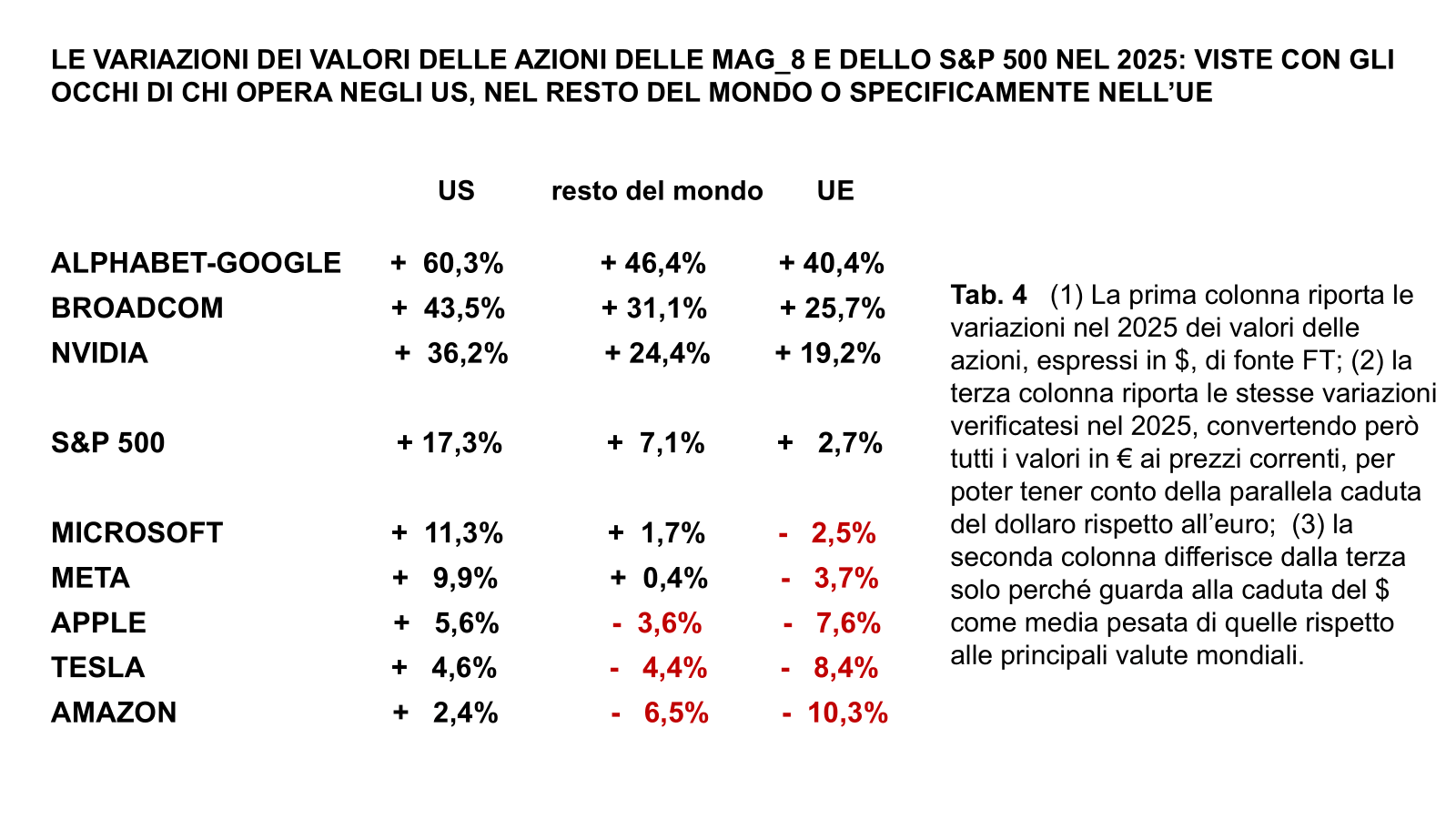 La Tab. 4 mostra chiaramente – nella prima colonna che riporta i dati originali in $ – che solo tre delle MAG_8 sono cresciute nel 2024 più dello S&P 500, ma che tutte comunque sono cresciute in valore assoluto.