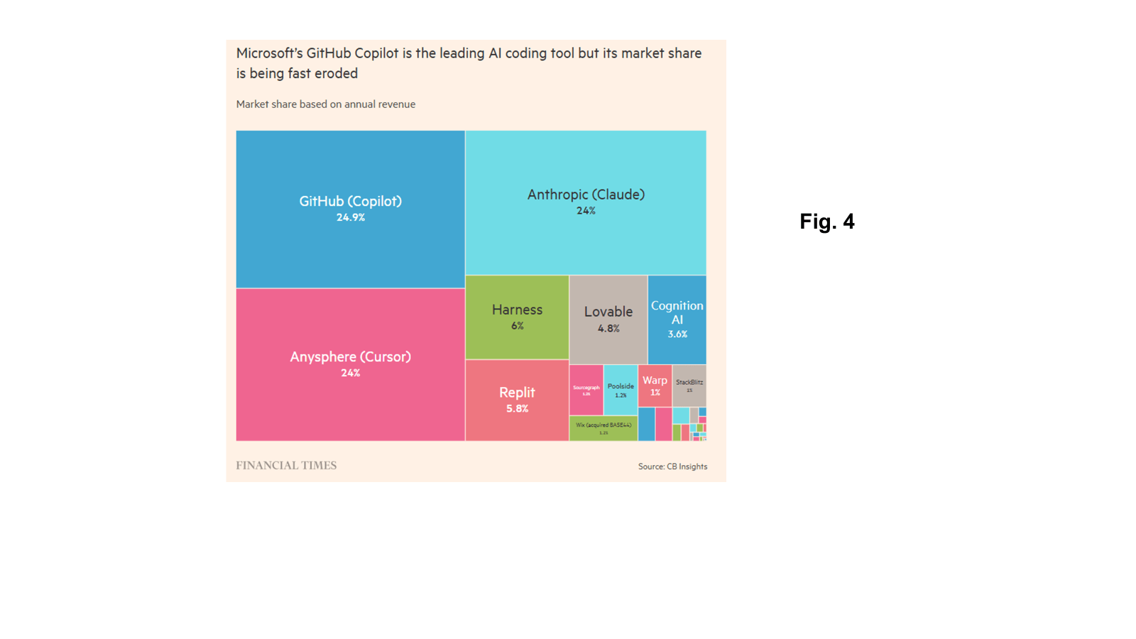 - soffre il fatto che pur continuando a essere (Fig. 4) il suo “GitHub Copilot” leader negli “AI coding tools”, la sua posizione è crescentemente insidiata da una serie di startup, quali in primo luogo Anthropic con Claude e Anysphere con Cursor,