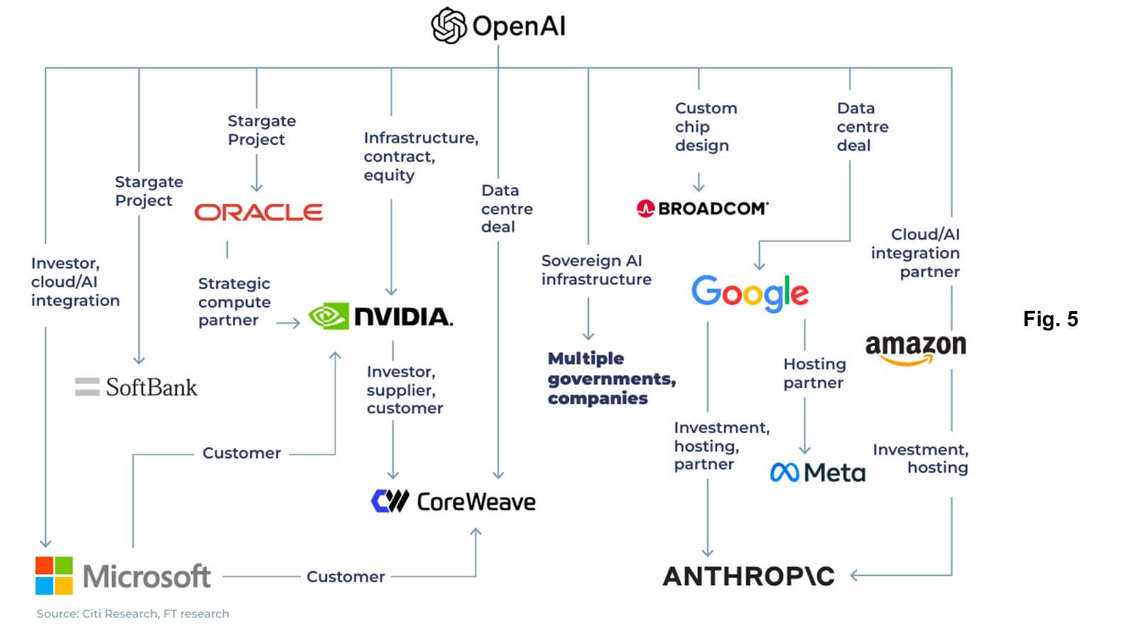 La “ragnatela” di accordi (Figg. 5, 6 e 7) e gli 1,4 trilioni di $ che essa si è impegnata con tali accordi a spendere nei prossimi anni per la costruzione negli US di una rete di data center a suo uso esclusivo, che le permetta di dipendere sempre meno nel futuro dai grandi cloud di