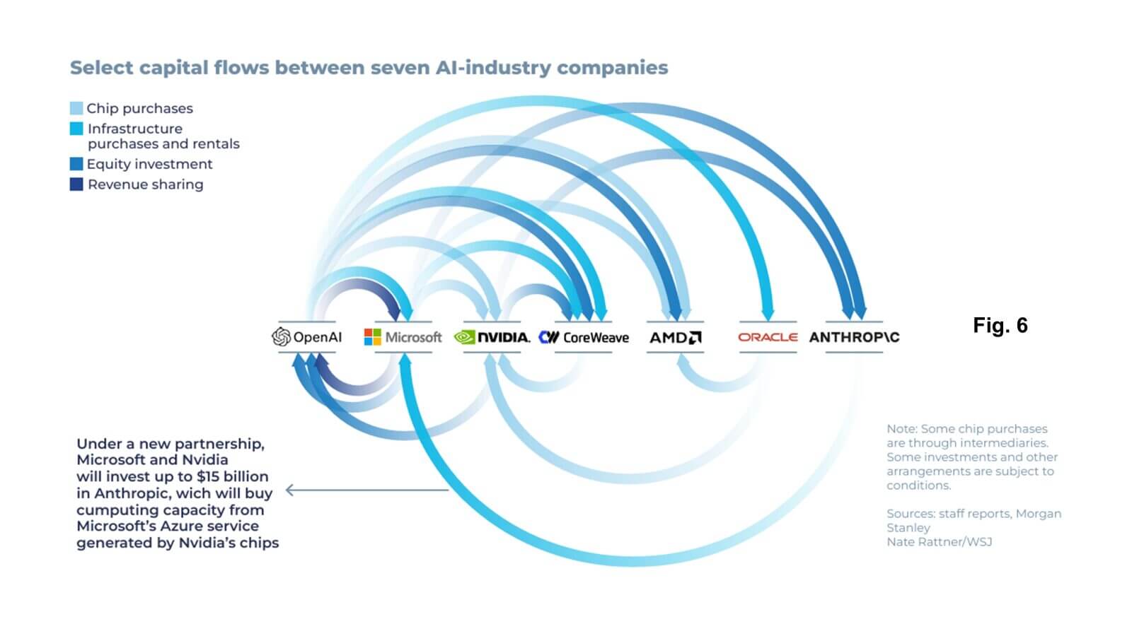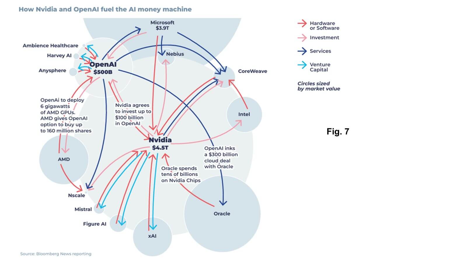 Nvidia a sua volta, la massima beneficiaria del lancio dell’AI generativa, è una delle maggiori protagoniste nella costruzione di quella “ragnatela” di accordi (molti dei quali come detto “circolari”) che dovrebbero proteggere la domanda futura delle sue GPU da una concorrenza che si profila più agguerrita (Figg. 5,6 e 7, commentate nel seguito nel capitoletto dedicato a OpenAI).