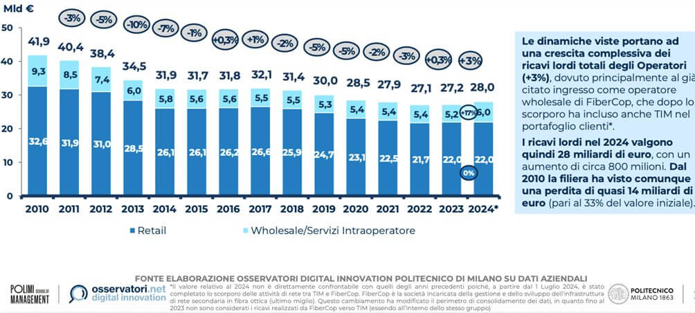 Il punto di partenza per comprendere la rilevanza delle tecnologie di observability e automation non può che essere economico. Il settore delle telecomunicazioni, in Italia come in gran parte d’Europa, vive da oltre un decennio una progressiva erosione dei ricavi che non ha eguali in altri comparti industriali a così alta intensità di capitale. Nel caso italiano, i dati più recenti mostrano con chiarezza la portata del fenomeno: i ricavi complessivi dei servizi di telecomunicazione sono passati da circa 42 miliardi di euro di quindici anni fa a poco più di 27 miliardi a fine 2024, come evidenziato nell’ultimo rapporto annuale di ASSTEL pubblicato a novembre del 2025 (figura 1).