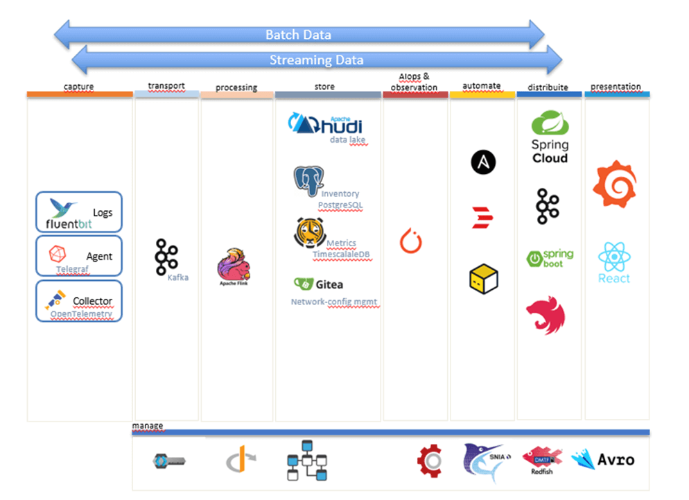 La realizzazione di una piattaforma sovrana di observability e automation non può limitarsi alla selezione di singoli strumenti open source, ma richiede una vera e propria architettura end-to-end, capace di coprire l’intero ciclo di vita del dato operativo e di trasformarlo in conoscenza e azione. È esattamente questo il razionale alla base della opportunità di costruire una piattaforma italiana di nuova generazione facendo leva su software open source consolidati, integrati in modo coerente e completati con componenti di governo, automazione e presentazione.