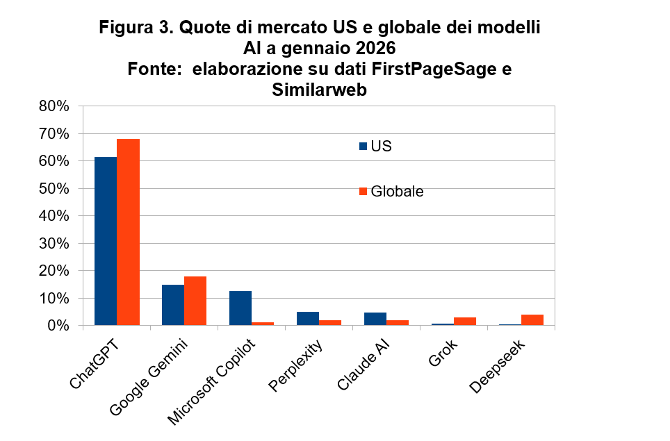 E’ significativa la differenza delle quote di mercato misurate negli US rispetto a quelle misurate a livello globale. Come si vede dalla figura 3, sono soprattutto le quote di Microsoft, Claude, Perplexity, Grok e DeepSeek che divergono tra i dati dell’ America e quelli globali. Perplexity (+370%) e Claude incalzano ChatGPT negli Stati Uniti, mentre Gemini (+237% di crescita), Grok e DeepSeek la incalzano sul mercato globale.