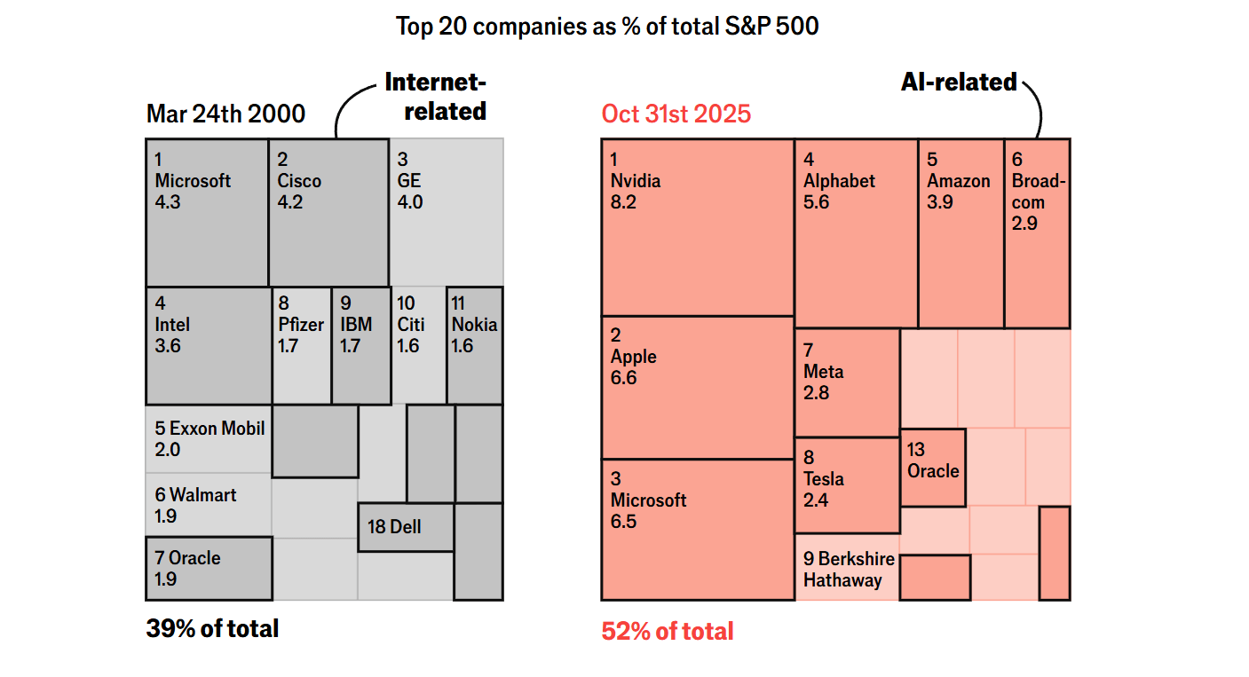Oggi le prime 20 rappresentano il 52%, con lo stesso numero di aziende che hanno investito massicciamente nell’intelligenza artificiale. Se la tecnologia non riuscisse a garantire rendimenti succulenti, tutte queste aziende ne risentirebbero pesantemente, insieme a un gran numero di investitori anche di piccolo importo.