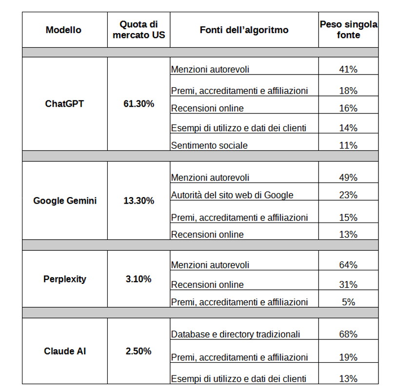 Figura 5. Principali modelli americani e relative quote di mercato e peso delle loro fonti[8].