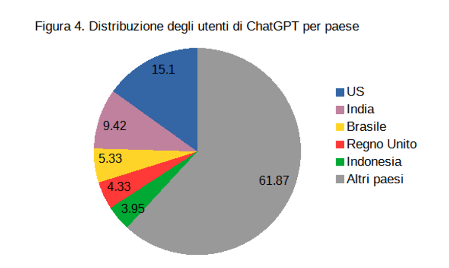 Se guardiamo all’incumbent OpenAI, la sua ChatGPT è sulla buona strada, con ricavi annuali che, estrapolando il dato di giugno 2025 su base annua, raggiungerebbero i 10 miliardi di dollari (ricordiamoci che nelle sue previsioni sono indicati 125 miliardi per il 2029!). Ma la sua distribuzione nel mondo vede solo il 15% degli utilizzatori negli Stati Uniti, come si vede dalla figura 4[5]. ChatGPT ha quindi assoluto bisogno del mercato globale, esattamente come Nvidia.