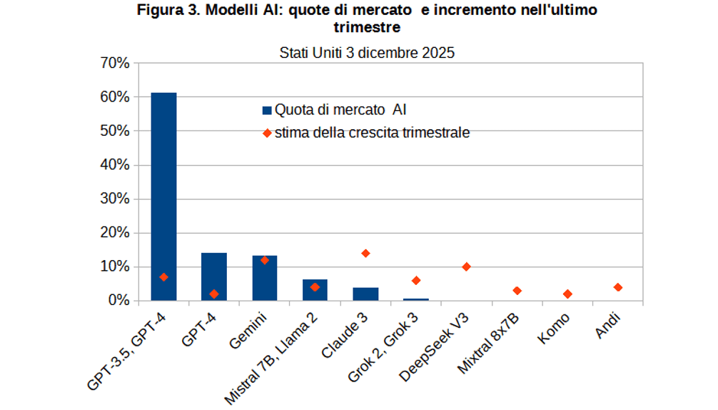 Nella grande spaccatura voluta dall’amministrazione americana, gli Stati Uniti sviluppano i loro modelli con grandi investimenti per mantenere la leadership nello sviluppo di AI. Ma, al contempo, gli Stati Uniti hanno una bassa propensione a utilizzarla. I dati relativi a quel solo mercato dimostrano anche che la spaccatura ha sospinto DeepSeek ai margini, anche se sta crescendo piuttosto rapidamente (figura 3).