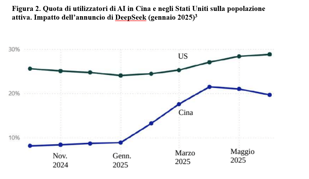 DeepSeek ha accentuato la spaccatura tra paesi occidentali e Cina, voluta dall’amministrazione americana, spaccatura lungo i cui bordi, chi da una parte chi dall’altra, si sono allineati altri grandi paesi come l’India, il Brasile, l’Indonesia. L’impatto di DeepSeek, oltre agli effetti ricordati sulle quotazioni e sulle aspettative, si è tradotto, in Cina, in una esplosione nell’utilizzo dei modelli di AI generativa, come si vede dalla figura 1, dove – per altro – si può leggere anche un qualche impatto positivo sulla curva relativa agli Stati Uniti.