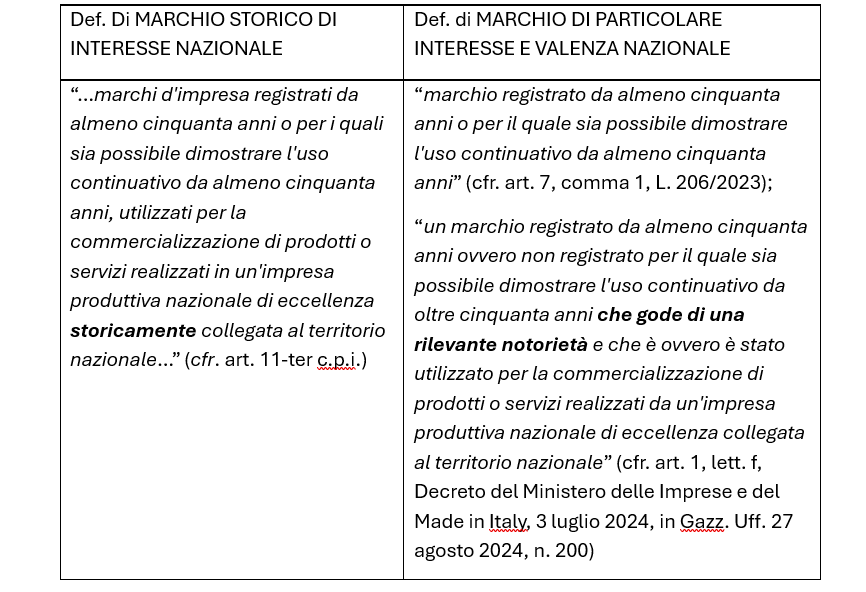 Numerosi i dubbi anche sul coordinamento tra “marchi di particolare interesse e valenza nazionale” (ex Art. 7, LEGGE 27 dicembre 2023, n. 206) e “marchi storici di interesse nazionale” (introdotti nel 2019 all’art. 11-ter c.p.i.), a cui la nuova normativa non fa riferimenti espressi, sebbene le rispettive definizioni sembrano essere molto simili. Si riportano le due definizioni a confronto: