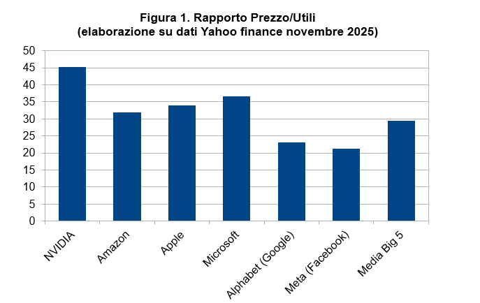 La quotazione di Nvidia, anche se non sta brillando da qualche settimana, è comunque ancorata a un moltiplicatore price/earning (P/E) significativamente più elevato della già elevata media di big tech, come si vede dalla figura 1[1].