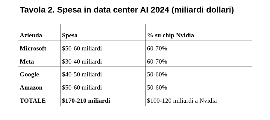 Nella tabella seguente viene riportata la spesa per i data center delle maggiori protagoniste dell’AI, mettendo in evidenza la quota destinata ai processori Nvidia. In media, intorno al 60% della spesa per i data center va ad acquistare i processori di Nvidia: la convenienza a liberarsi dalla dipendenza è enorme e la battaglia, ancora agli inizi, sui fronti economico, tecnologico e finanziario, è una delle più importanti di questo primo quarto di secolo[7].