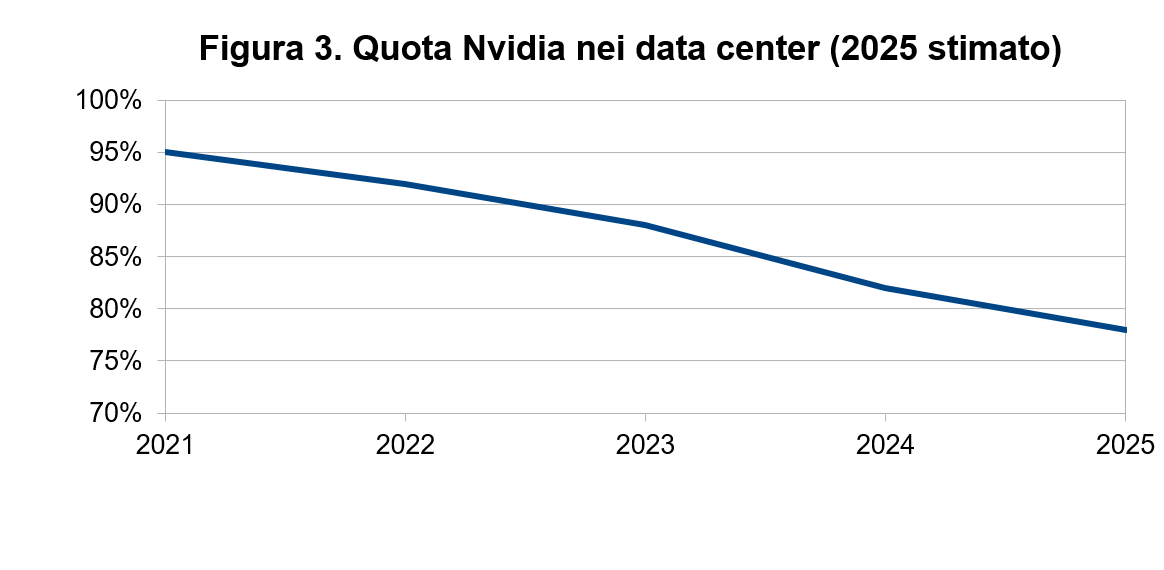 La quota di Nvidia, per effetto di questa pressione concorrenziale, sta decrescendo negli anni recenti, pur mantenendosi a livelli eccezionalmente elevati, come si vede dalla figura 3.