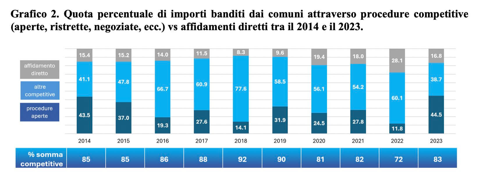 In sintesi, in uno scenario di crescita della spesa per il procurement, la quota degli importi banditi con procedure competitive non è aumentata, seppure esse vengano impiegate di fatto per assegnare una larga maggioranza di fondi comunali.