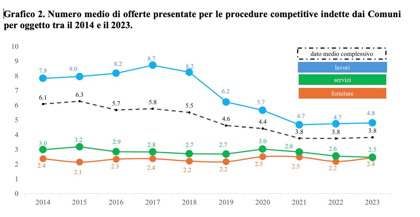 In parte lo è ancora, ma dal 2021 al 2023 il numero medio di proposte pervenute per un bando dedicato a lavori è rimasto inferiore a cinque. Per servizi e forniture non si è invece mai saliti sopra alle 3 offerte.