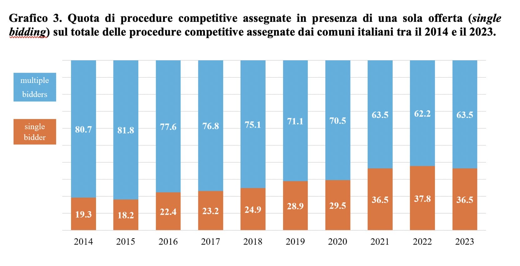 Se abbiamo visto come la quota percentuale di importi aggiudicati dai Comuni attraverso procedure competitive risulti comunque elevata, quel dato non tiene conto del diffuso fenomeno del single bidding, ovvero dell’aggiudicazione di una procedura competitiva (aperta, negoziata, ristretta ecc.) a seguito della ricezione di un’unica offerta.
