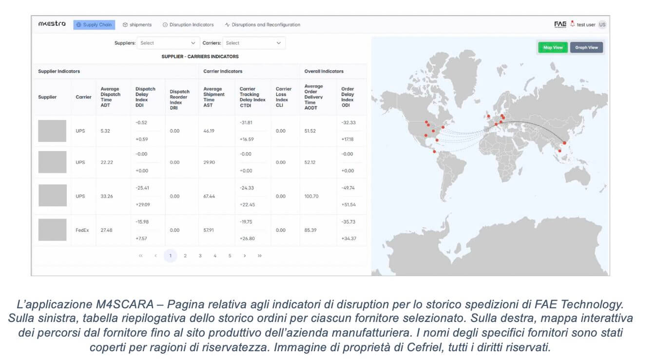 L’applicazione M4SCARA – Pagina relativa agli indicatori di disruption per lo storico spedizioni di FAE Technology. Sulla sinistra, tabella riepilogativa dello storico ordini per ciascun fornitore selezionato. Sulla destra, mappa interattiva dei percorsi dal fornitore fino al sito produttivo dell’azienda manifatturiera.