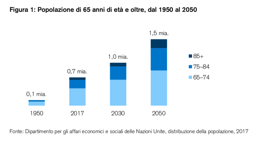 Analizziamo alcuni trend strutturali che supportano questa tematica: il primo è l’invecchiamento demografico, un fenomeno che si osserva già da tempo. “A causa del forte aumento dell’aspettativa di vita e degli importanti successi sul fronte della riduzione delle morti premature, la quota di persone molto anziane è destinata ad aumentare”, analizza Thomas Amrein, gestore di fondi di Credit Suisse.1
