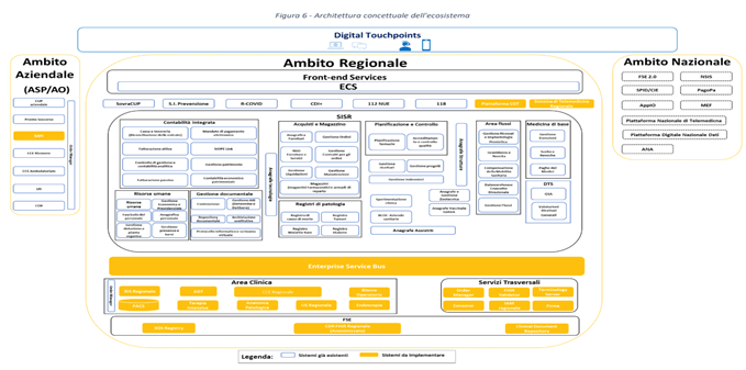 Nella fase iniziale ci si è occupati del disegno dell’architettura necessaria per ottenere questo risultato, valutando le Componenti Tecnologiche più adeguate al completamento dell’architettura Concettuale dell’Ecosistema informativo sanitario. L’architettura in oggetto racchiude la visione della Regione Calabria in relazione alle componenti applicative e infrastrutturali del sistema informativo del SSR (Sistema Sanitario Regionale).