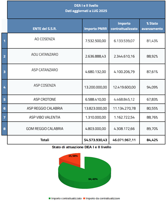 La Regione Calabria può contare su un finanziamento relativo alla Missione 6 pari a 496,573 Mln di euro per un totale di 542 progetti. Alla fine del mese di settembre sono stati chiusi 123 progetti. Ne rimangono attivi 419.