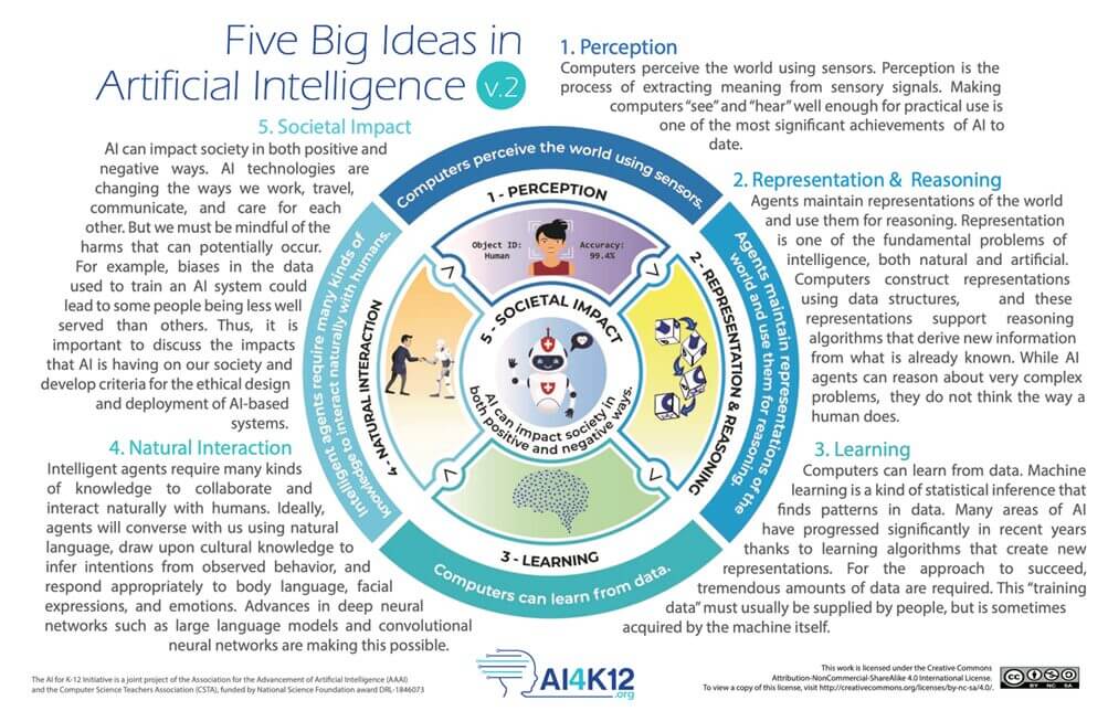 Negli Stati Uniti sono state proposte già dal 2018 delle Linee guida per quello che corrisponde al nostro primo e secondo ciclo (K-12), organizzate attorno a un modello denominato Big Five in AI, ossia le cinque grandi idee dell’intelligenza artificiale (Fig.1):