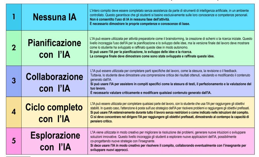 Nel 2024 la Finlandia ha comunque pubblicato anche le sue Linee guida, in collaborazione con Faktabaari, un servizio finlandese di fact-checking e alfabetizzazione digitale dell’informazione, avviato nel 2014. Le linee guida contengono anche la prima scala di valutazione dell’AI (Perkins, Furze, Roe, & MacVaugh, 2024; Perkins, Roe & Furze, 2025), che può essere utilizzata per chiarire sia agli studenti che ai docenti quale sia l’uso appropriato o inappropriato dell’IA in un compito. A fine settembre del 2025 è stato pubblicato un articolo dagli stessi autori della prima versione, che propone un aggiornamento della scala. Le novità sono il chiarimento delle basi teoriche della scala attraverso i principi del costruttivismo sociale, lo sviluppo dell’AIAS come quadro di riferimento per la riprogettazione della valutazione al fine di migliorarne la validità e l’adeguamento delle risorse visive affinché funzioni in modo inclusivo e non gerarchico. Alle voci già presenti è stata aggiunta la possibilità di utilizzare l’AI in chiave creativa e in collaborazione con gli insegnanti (Fig.2).
