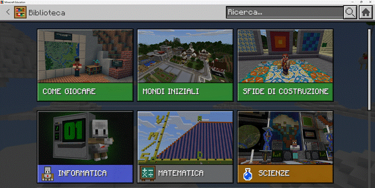 Foto 1. Biblioteca didattica di Minecraft Education. Schermata iniziale della sezione “Biblioteca” di Minecraft Education mostra un’ampia gamma di contenuti educativi suddivisi per discipline, tra cui informatica, matematica, scienze nonché la disponibilità di sfide creative, offrendo agli studenti un modo interattivo per imparare giocando.